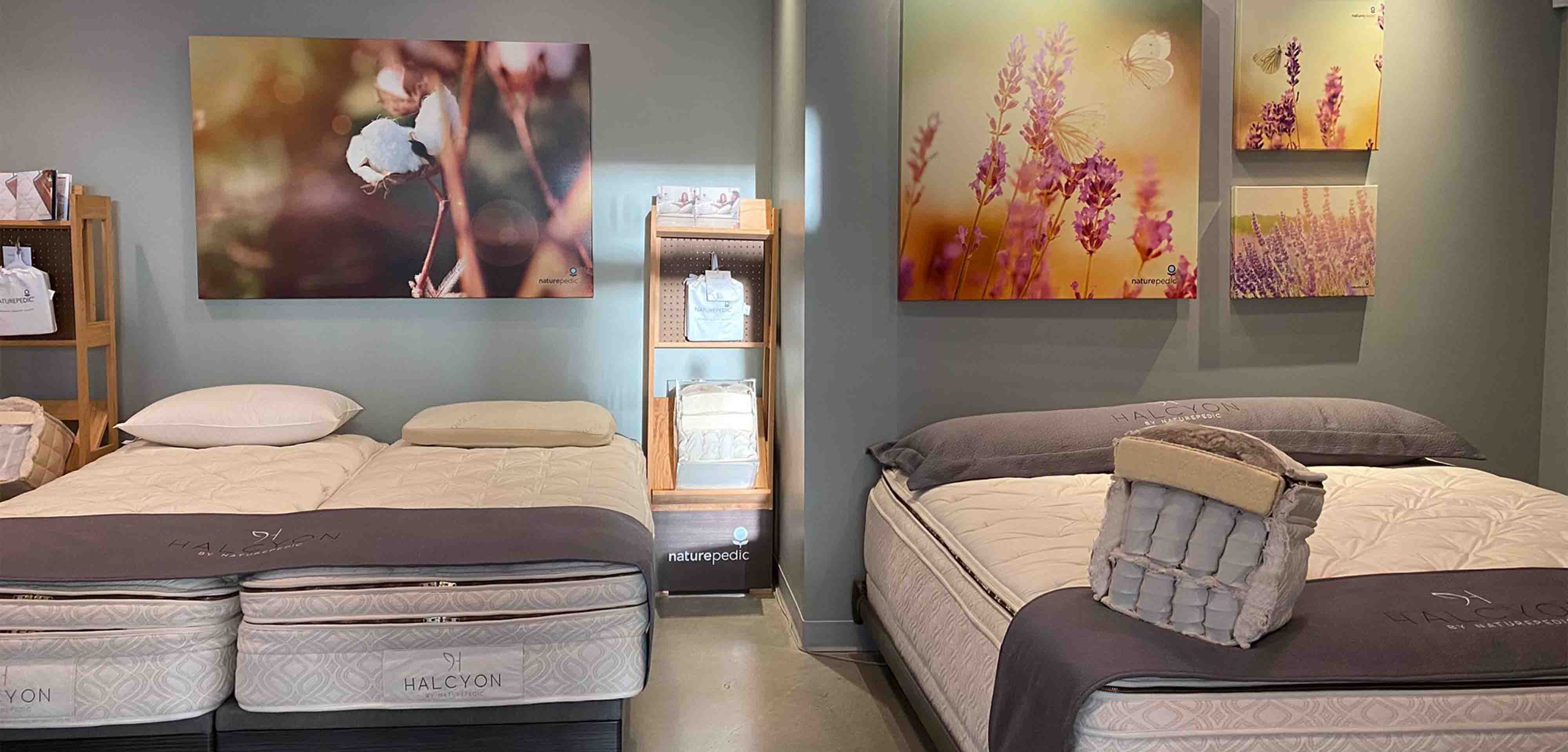 At Naturepedic Organic Mattress Store Vancouver, our store is mindfully designed as a calming, inspiring space complete with an organic coffee bar and music tailored to your vibe. We place fresh covers on every mattress and pillow you try and create an unhurried, personalized experience – because we genuinely care about your sleep.