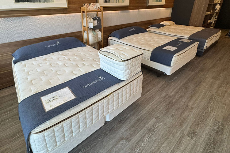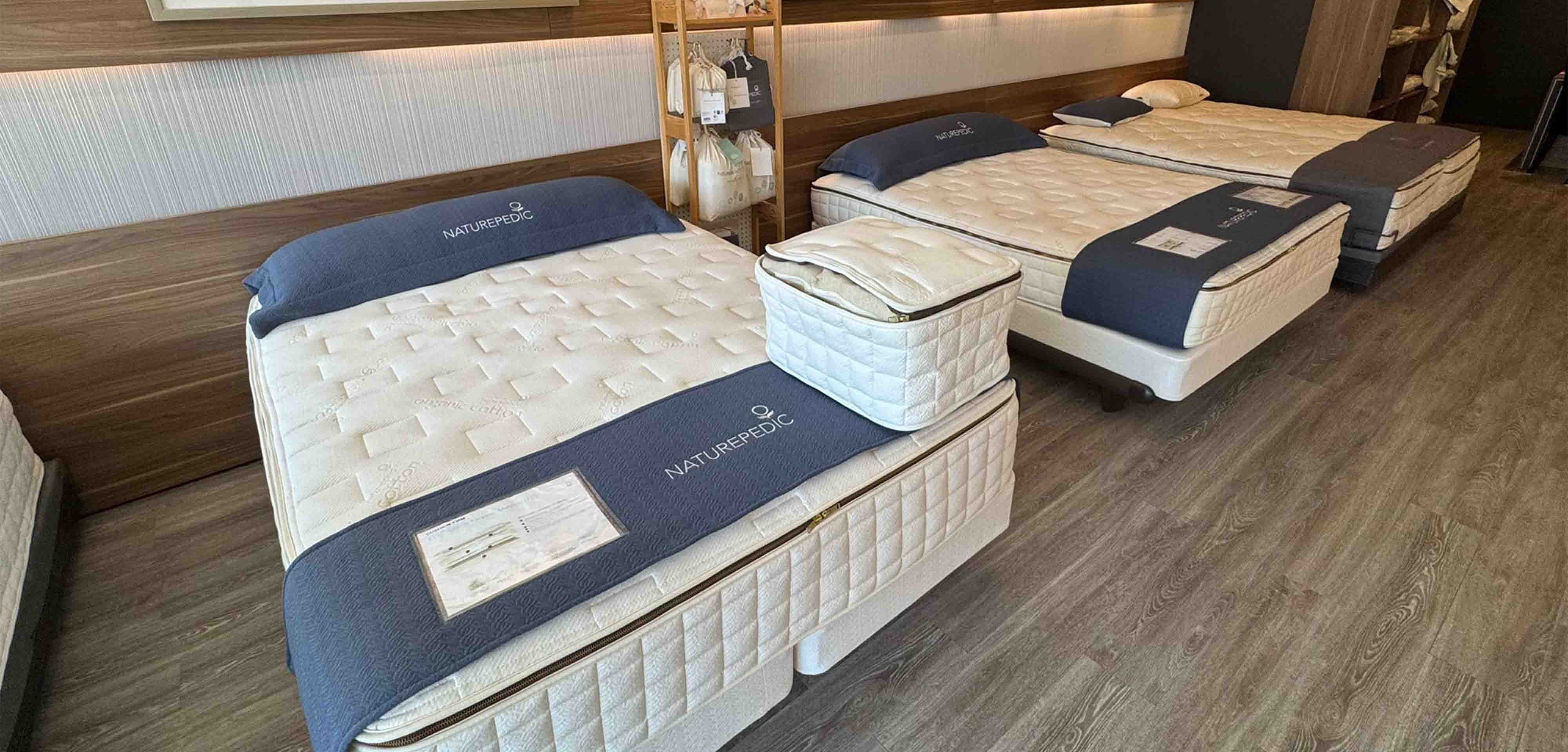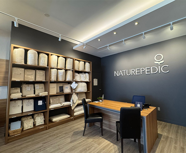At Naturepedic Organic Mattress Store Leaside, our store is mindfully designed as a calming, inspiring space complete with an organic coffee bar and music tailored to your vibe. We place fresh covers on every mattress and pillow you try and create an unhurried, personalized experience – because we genuinely care about your sleep.